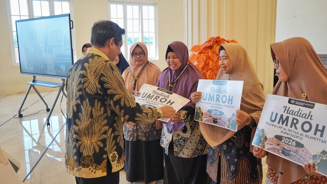 Purwokerto — Lajnah Pendidikan dan Pengajaran (LPP) Al Irsyad Al Islamiyyah Purwokerto memberikan reward umrah kepada 13 guru dan karyawan dalam kegiatan Stadium General yang diselenggarakan pada Sabtu, 20 Desember 2025. Acara berlangsung di Hall Masjid Al Irsyad Purwokerto dan dihadiri oleh seluruh guru serta karyawan dari semua jenjang sekolah di bawah naungan Al Irsyad Al Islamiyyah Purwokerto.