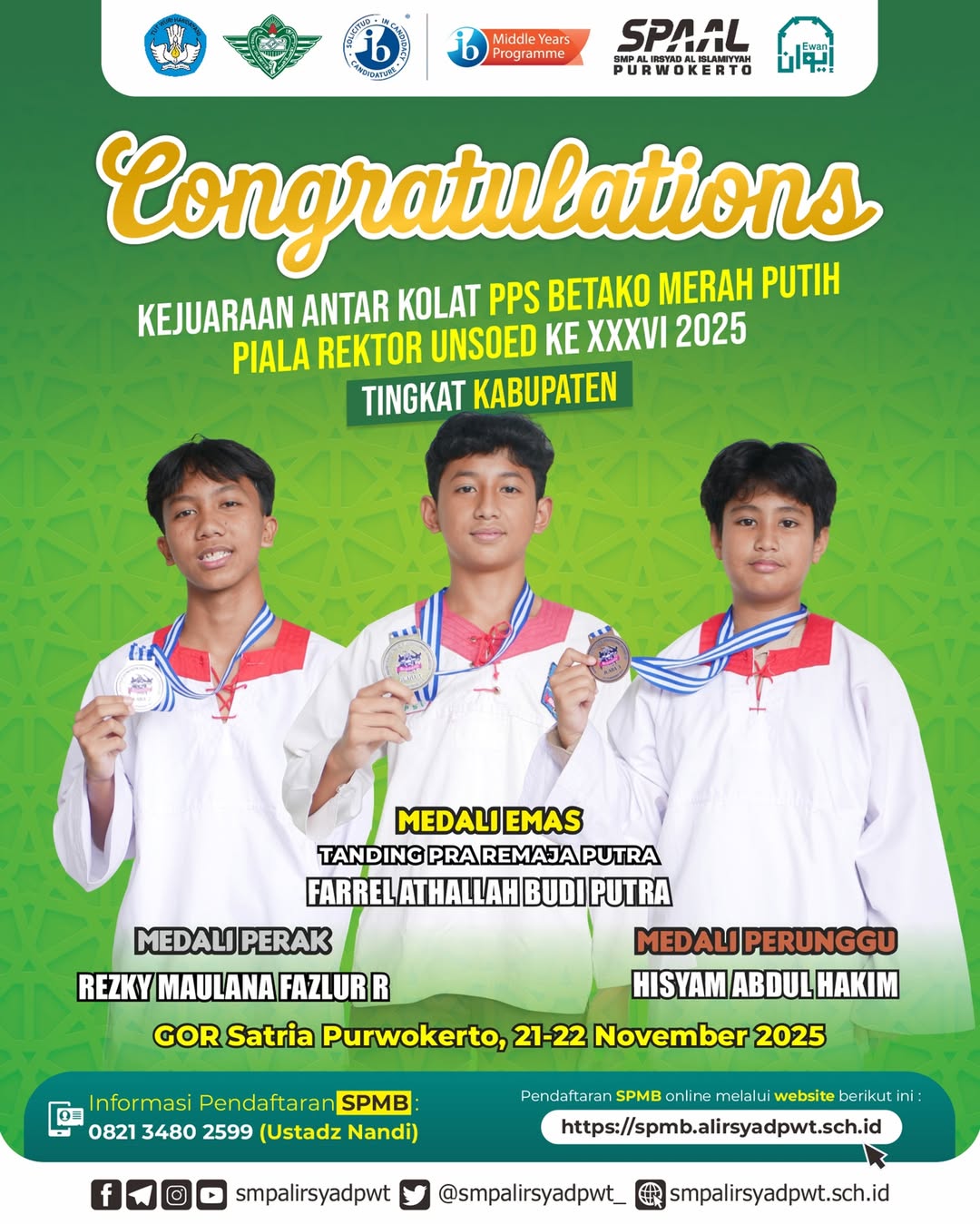 Dengan semangat juang tinggi, disiplin, serta kerja keras selama latihan, para atlet muda SMP Al Irsyad berhasil meraih sejumlah medali dari berbagai kategori tanding dan seni. Prestasi ini menjadi bukti komitmen sekolah dalam mendukung pengembangan bakat dan potensi siswa, khususnya di bidang olahraga bela diri.