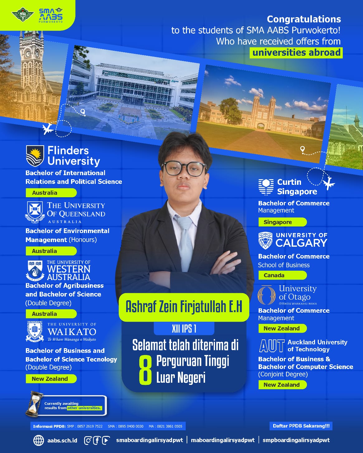 Sementara itu, Ashraf Zein Firjatullah E.H (XII IPS 1) berhasil meraih 8 penerimaan dari berbagai kampus internasional, yaitu Flinders University, The University of Queensland, University of Western Australia (Top 100 dunia), Curtin Singapore, University of Calgary, University of Otago, Auckland University of Technology, serta Curtin University Australia. Bidang yang diminatinya meliputi hubungan internasional, manajemen lingkungan, serta bisnis dan teknologi.