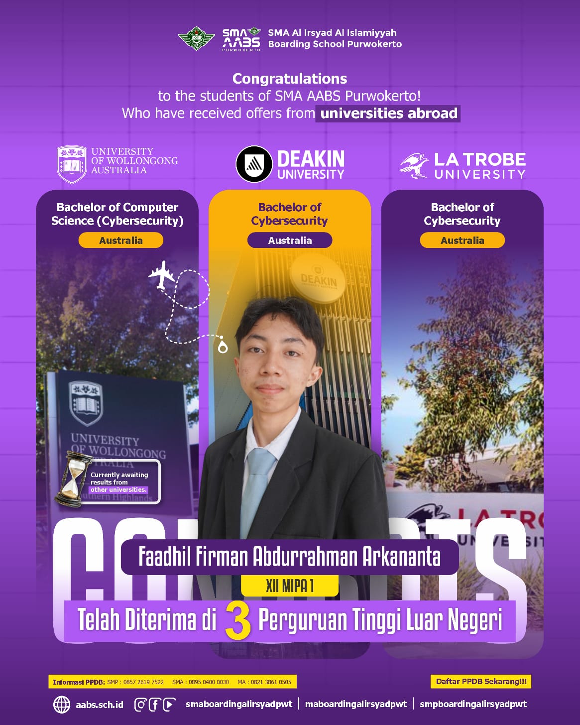 Tak kalah membanggakan, Faadhil Firman Abdurrahman Arkananta (XII MIPA 1) memperoleh 3 penerimaan di bidang cybersecurity. Ia diterima di University of Wollongong, Deakin University, dan La Trobe University di Australia yang dikenal memiliki program teknologi dan keamanan siber yang kompetitif di tingkat internasional.