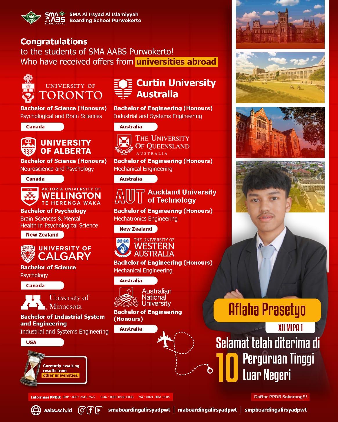 Purwokerto — Prestasi membanggakan diraih oleh siswa SMA Al Irsyad Al Islamiyyah Boarding School (AABS) Purwokerto. Tak tanggung-tanggung, tiga siswa berhasil meraih total 21 penerimaan di berbagai kampus internasional, termasuk sejumlah universitas papan atas dunia di Australia, Kanada, Selandia Baru, hingga Singapura.
